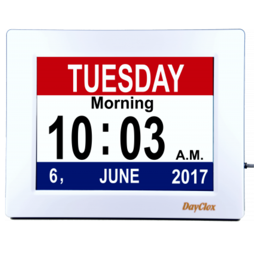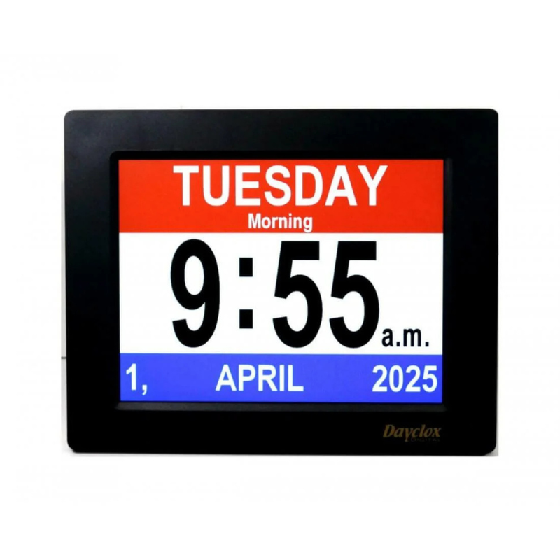 Easy to Read Digital Calendar Day Clock. This clock has easy configuration from black and white to colour and has the ability to be set in one of 15 different languages.