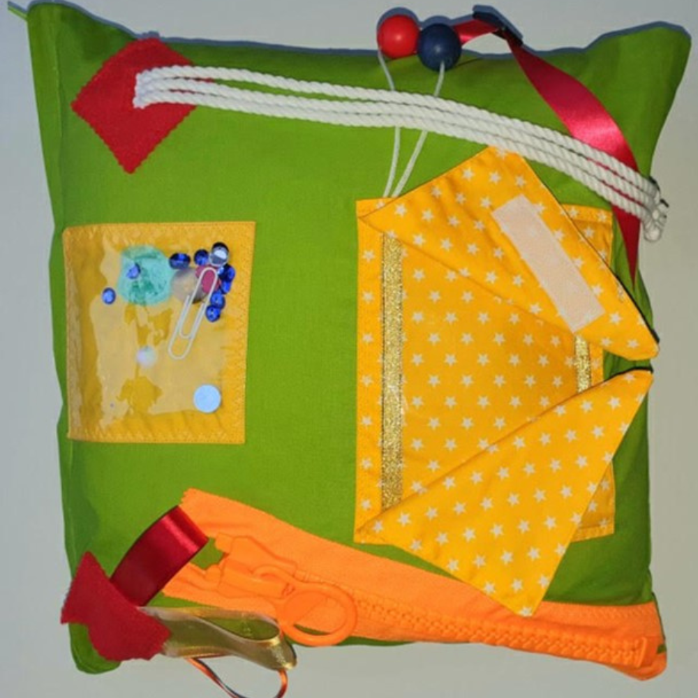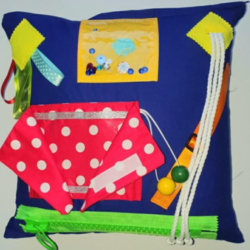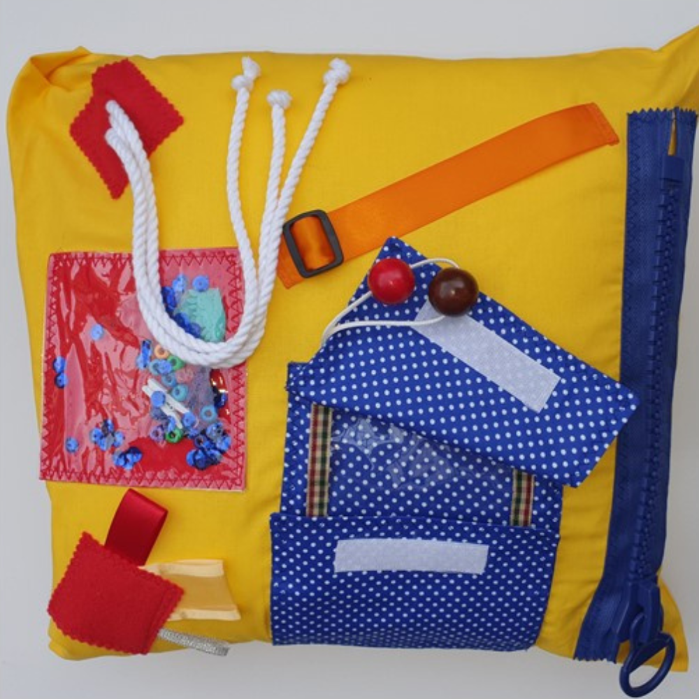 Anyone with fidgety fingers will love this comfy cushion with an assortment of sensory attachments to stroke, thread, twist, move and twiddle with.