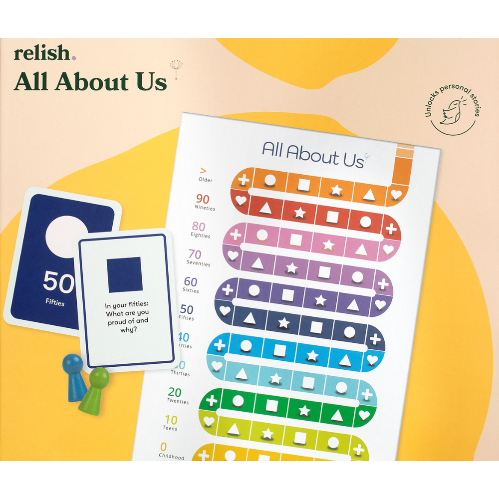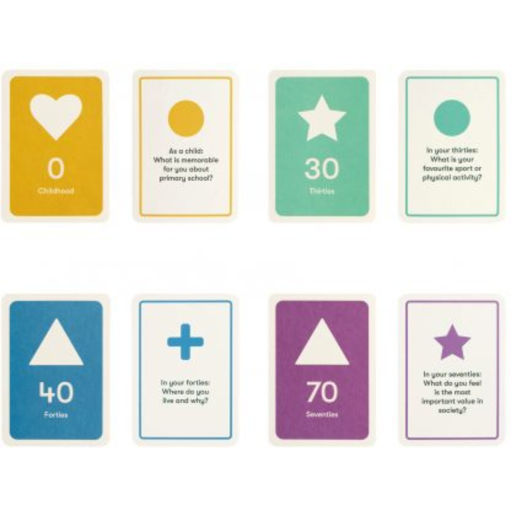 A first of its kind, our brand-new life-storytelling boardgame uses conversation as a way of exploring your life from childhood through the present and into the future. It invites you to think and talk about who you are, your experiences, feelings and values and what you have done and want to do, supporting those all-important feelings of identity, independence and sense of purpose, while building closer relationships.
