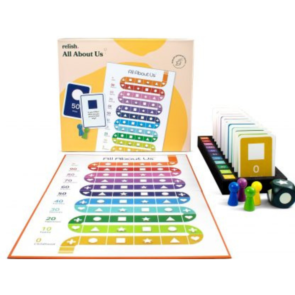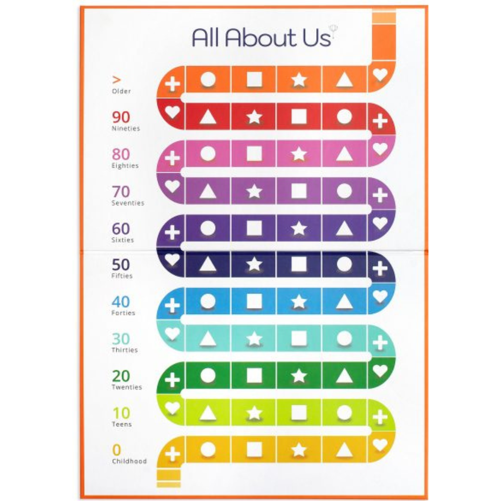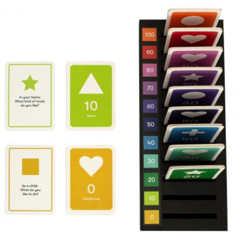 Each player takes a turn by throwing the dice, moving the counter, and selecting a card, to read out and answer a question card about their life experiences. Divided into the decades of life, players answer questions that provide conversation starters about memories and the future, favourite activities, the people in their lives, personal skills, likes and values, dreams and wishes.