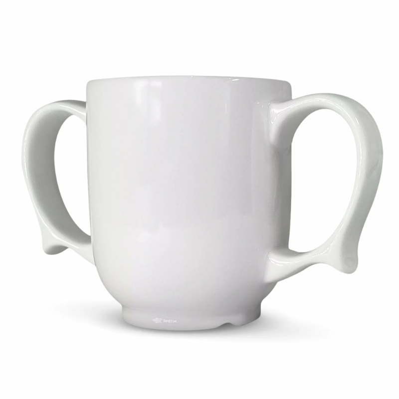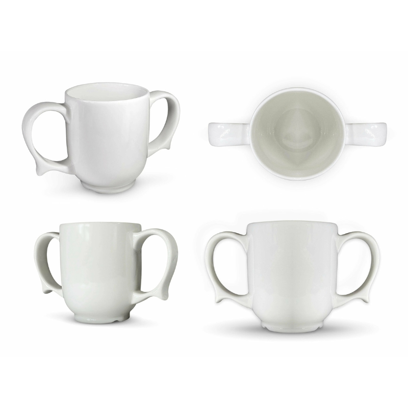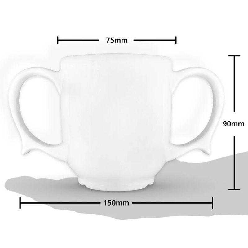 The handles have a lip towards the bottom which gives additional control for those with limited mobility, strength in the hands, or those experiencing tremors or shakes. Microwave and dishwasher safe. Mug size: 15.2cm x 8.9cm.