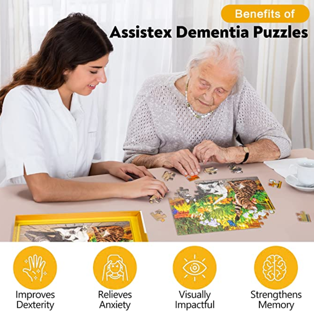 Cat & Flowers DEMENTIA PUZZLE – spend some quality time with your loved ones by engaging in this fun, cat themed dementia activity for seniors. Designed with a vibrant Cat & Flowers , this mature design jigsaw puzzle is reminiscent of the good old days and a great conversation starter too